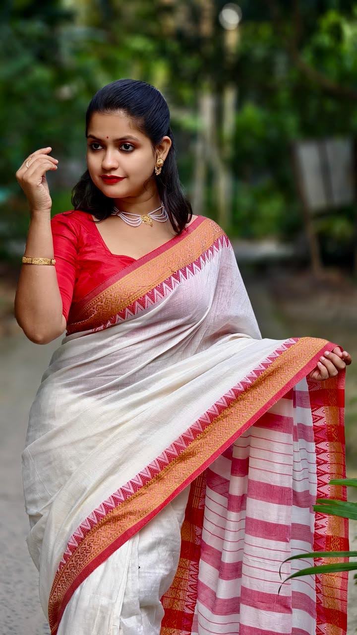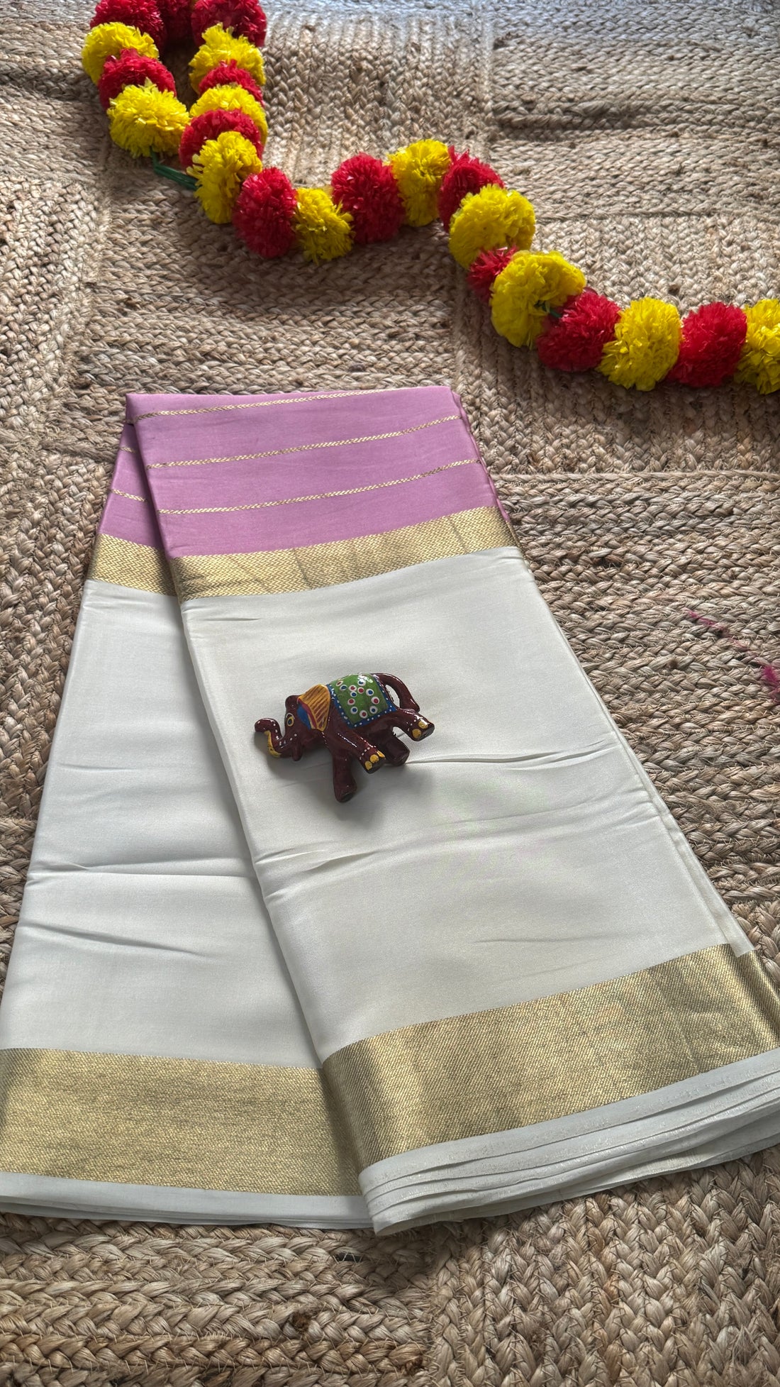 Mul Cotton : South India Style Off White with Pink & Green Boarder Saree