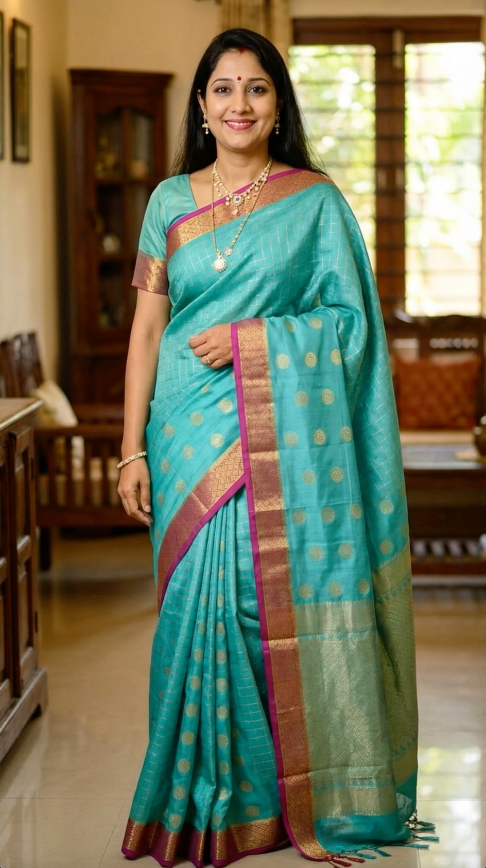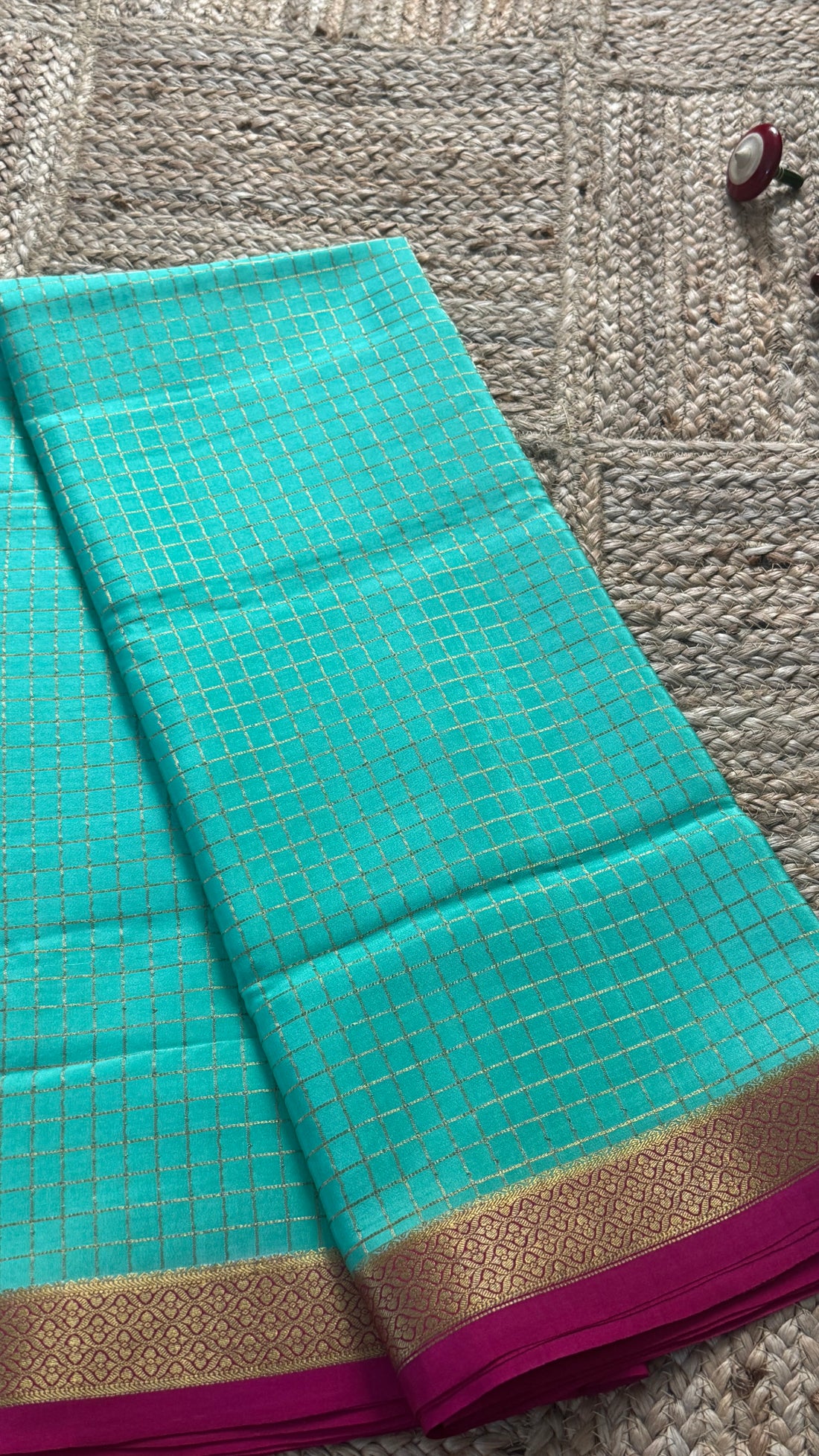 Prakriti Collections - Mysore Silk Centre Checks SeaBlue and Pink
