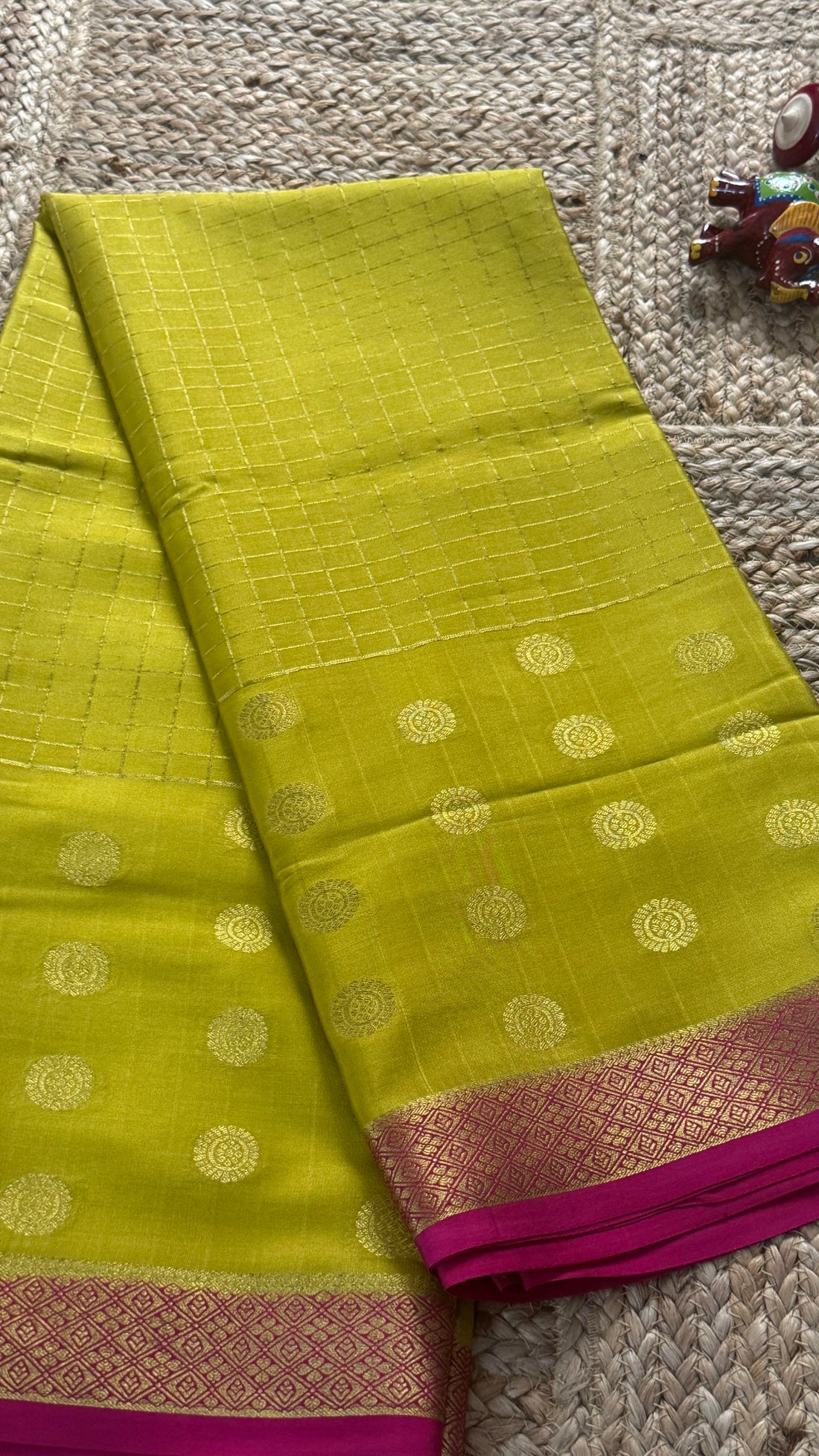 Prakriti Collections - Mysore Silk Centre Checks Mehandi Pink and Green