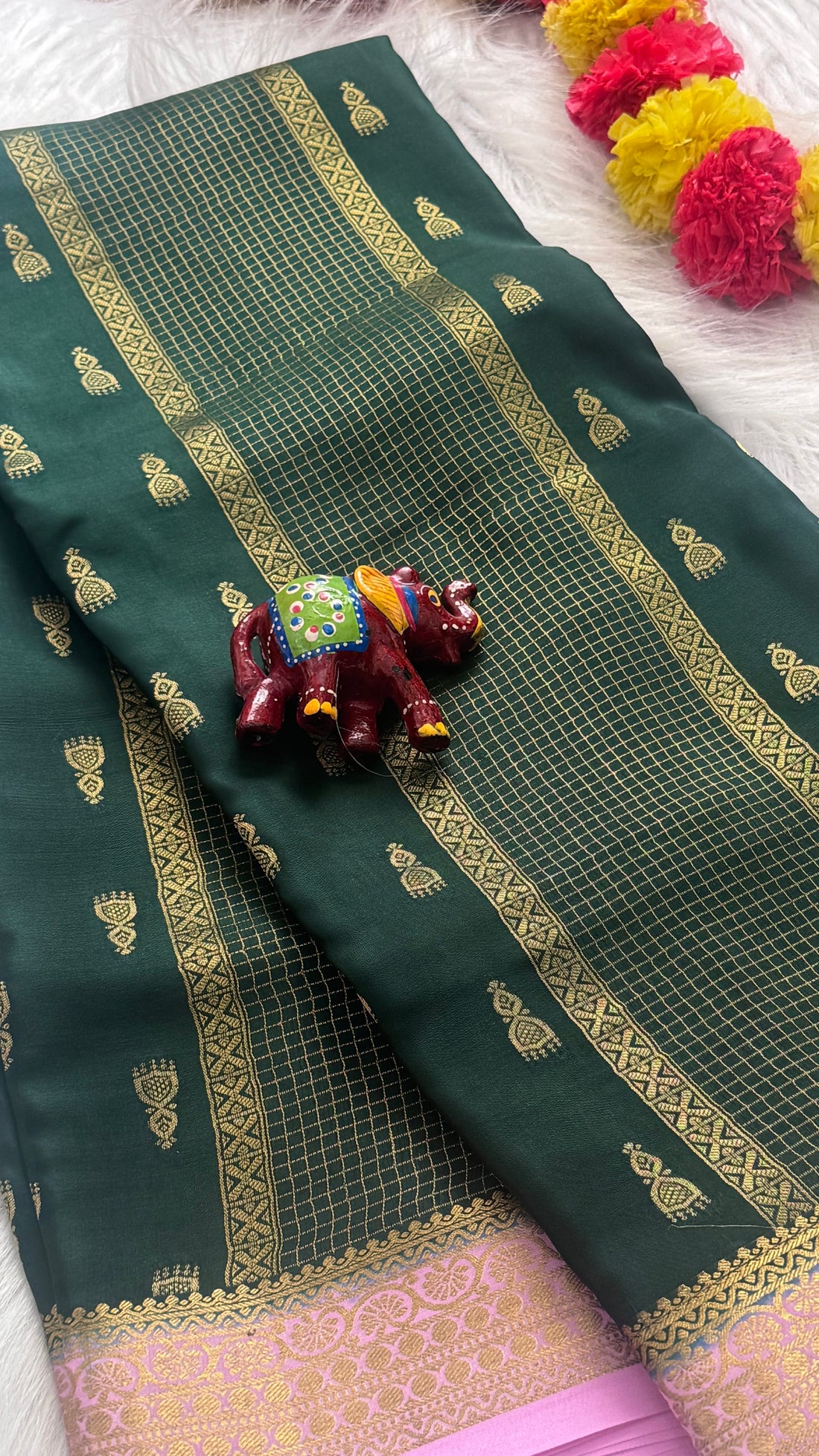 Pure Mysore Silk Saree - Jhumka Zari 2D Dark Green and Light Pink