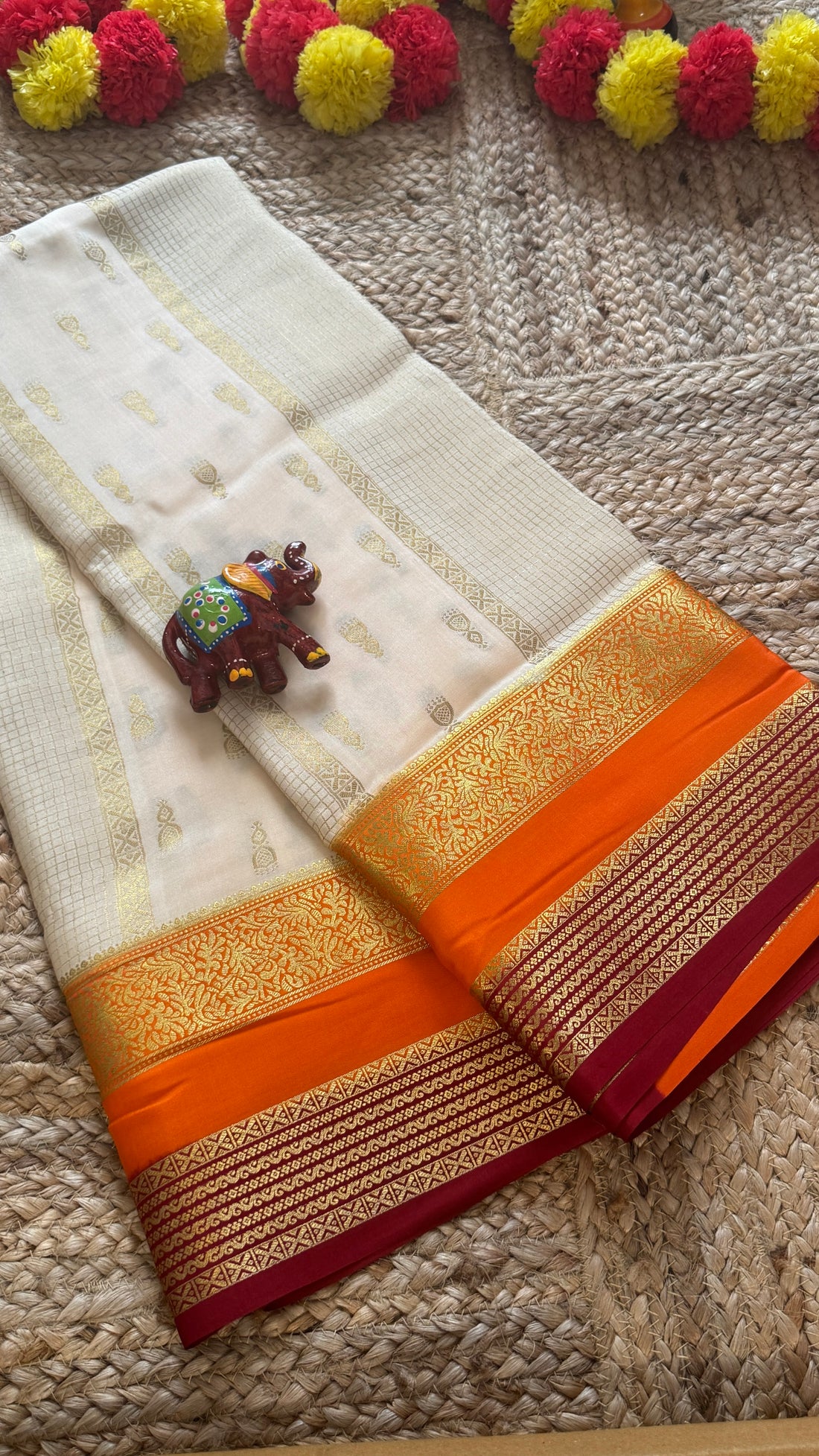 Pure Mysore Silk Saree - Jhumka Zari 3D Off White Orange and Maroon