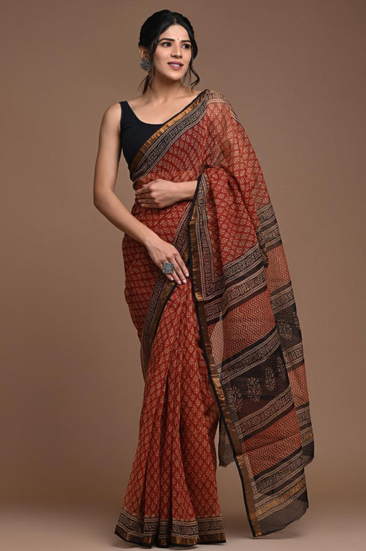Pure Mysore Silk Saree - Jhumka Zari 2D Rust Orange and Coffee Brown