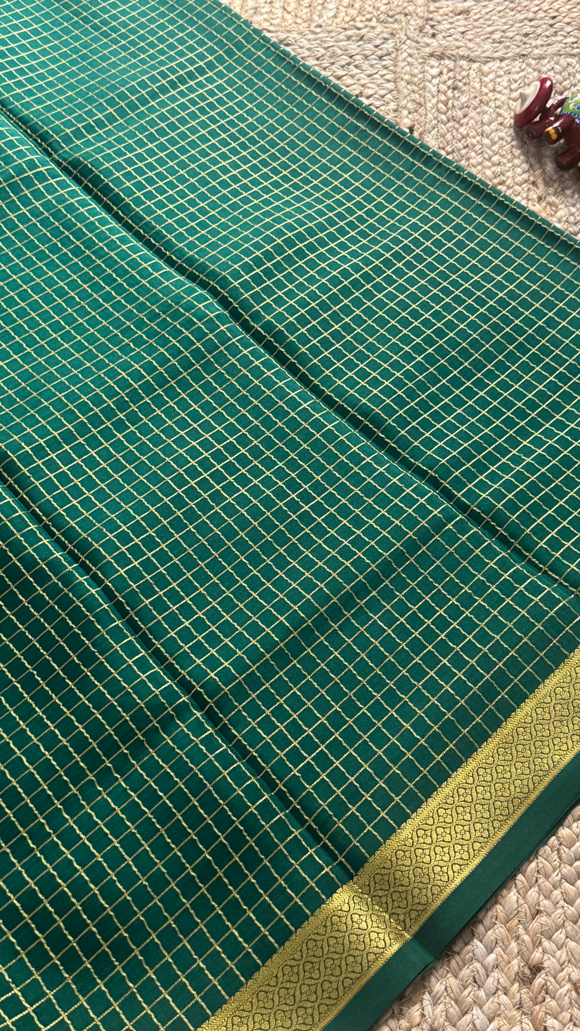 Gracefully crafted, this Pure Mysuru Crepe Silk Saree from our Mangalyam Collections features delicate small checks with a simple, elegant border, making it perfect for women who love understated tradition. Woven in 120 GSM pure silk, it offers a smooth drape, lightweight comfort, and timeless charm.