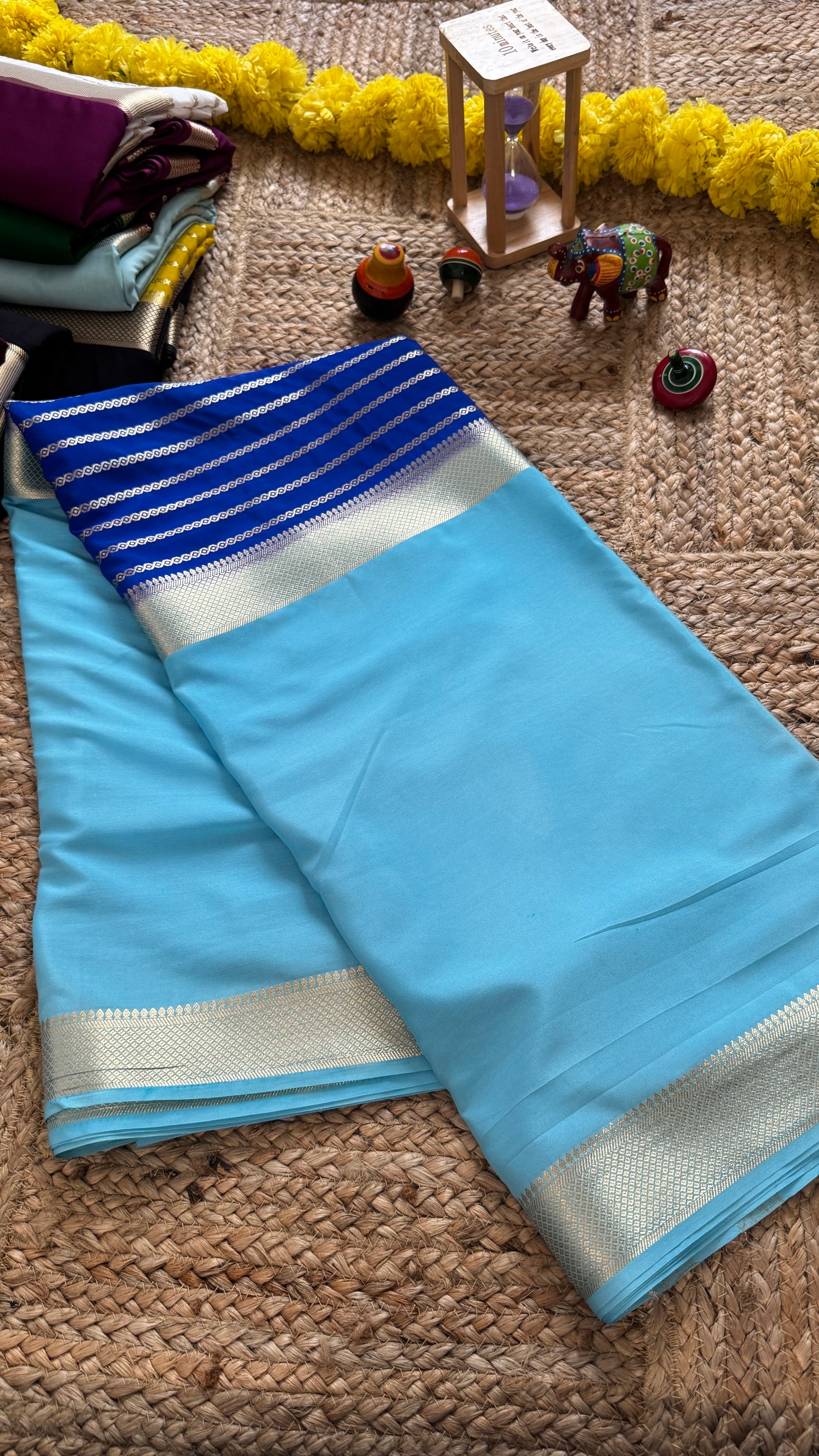 Sky Blue and Royal Blue - Premium Semi Mysore Crepe Silk Centre Stripes Saree