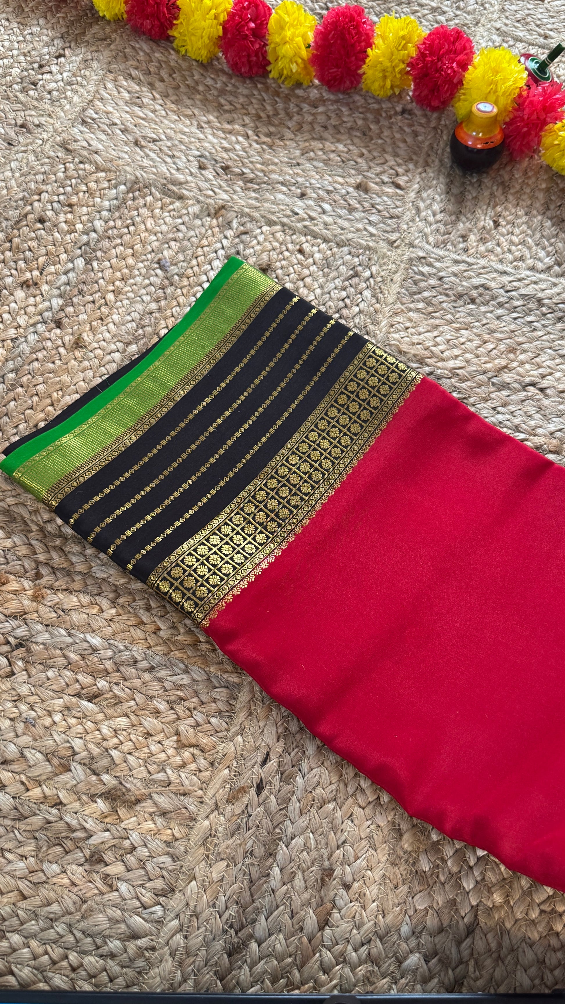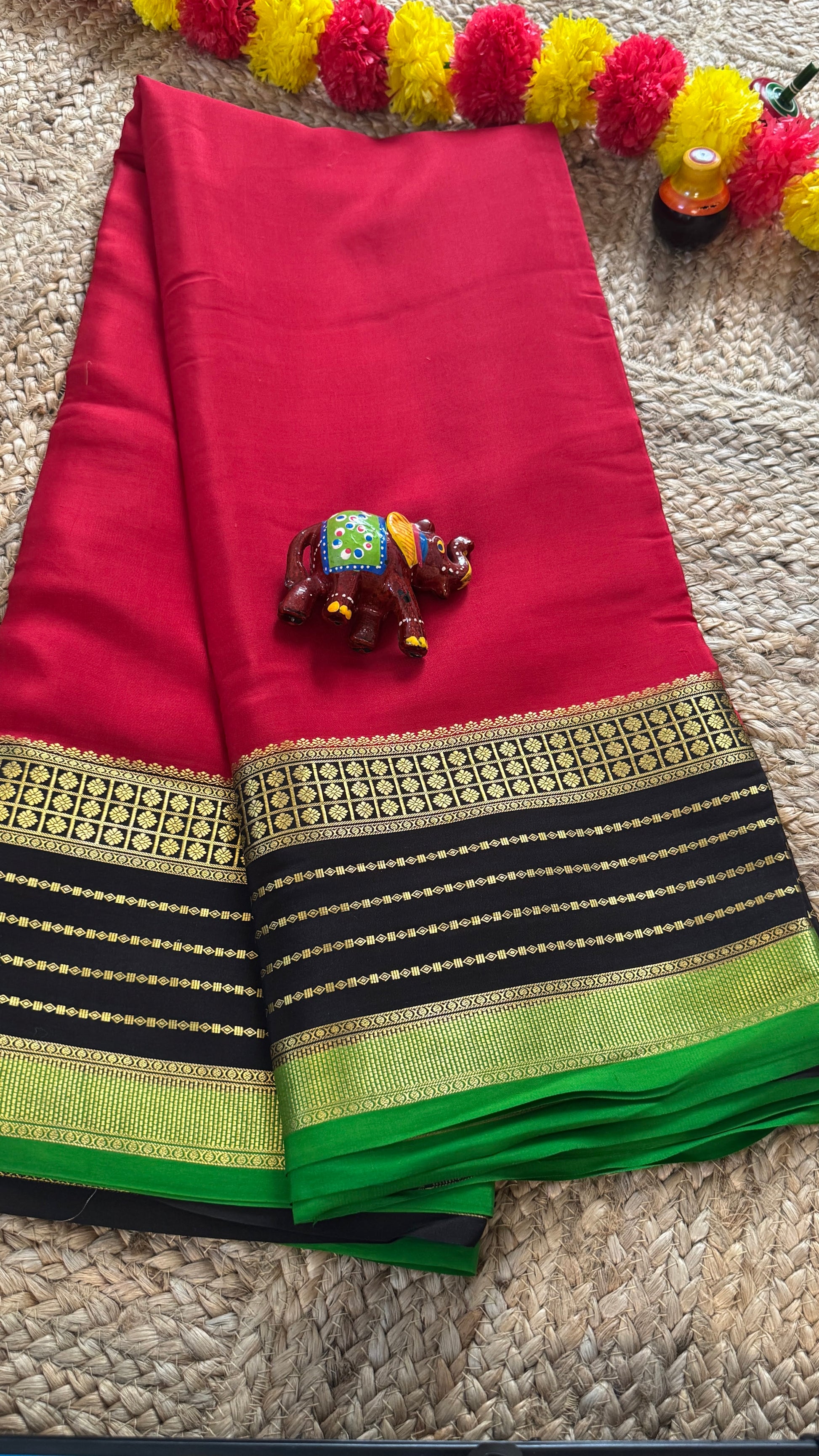 Pure Mysore Silk Saree - Boarder Lines Maroon + Black + Green