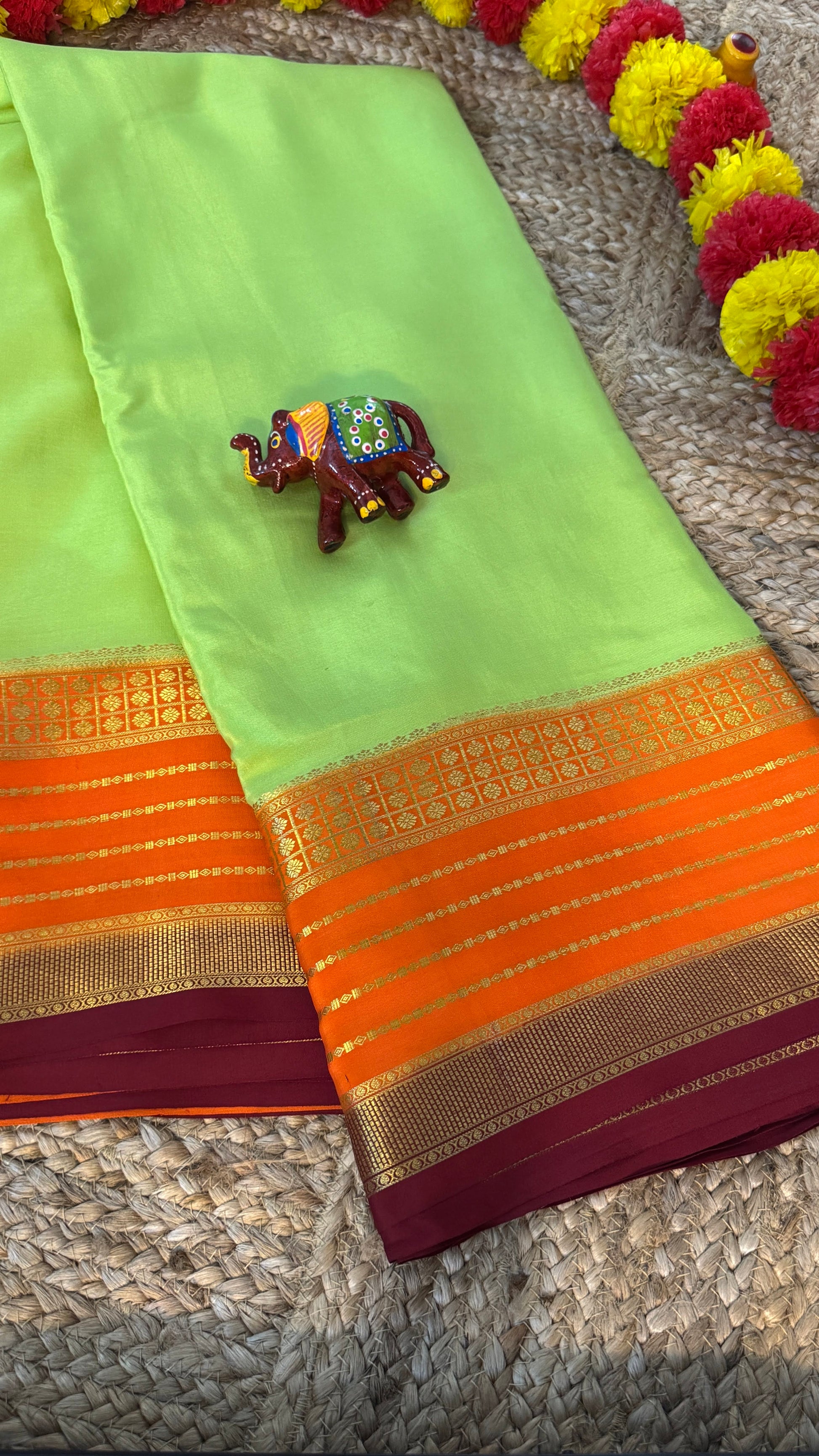 Pure Mysore Silk Saree - Boarder Lines ParrotGreen + Orange + Maroon