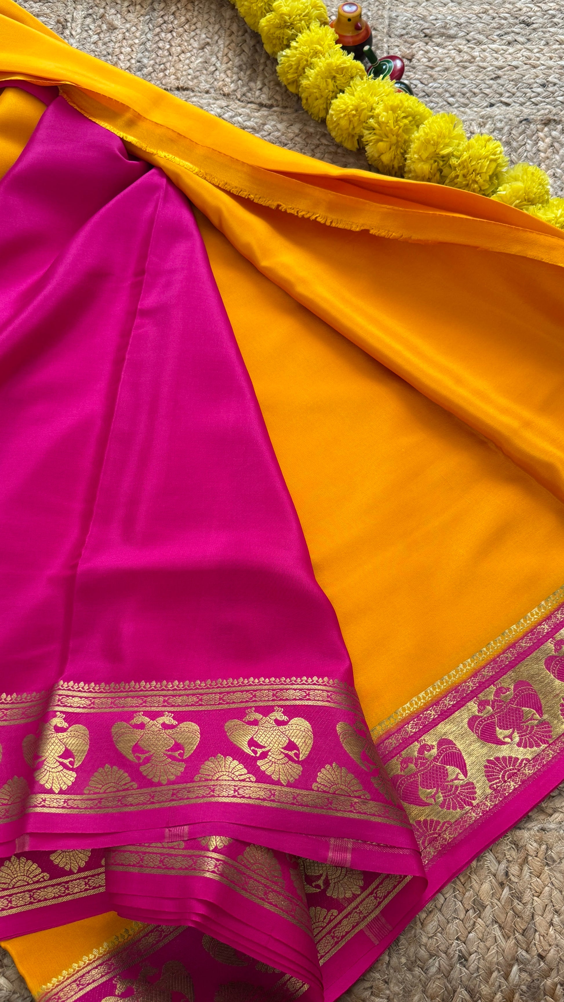 Pure Mysore Silk Saree - GandaBerunda Boarder Mustard Yellow Pink
