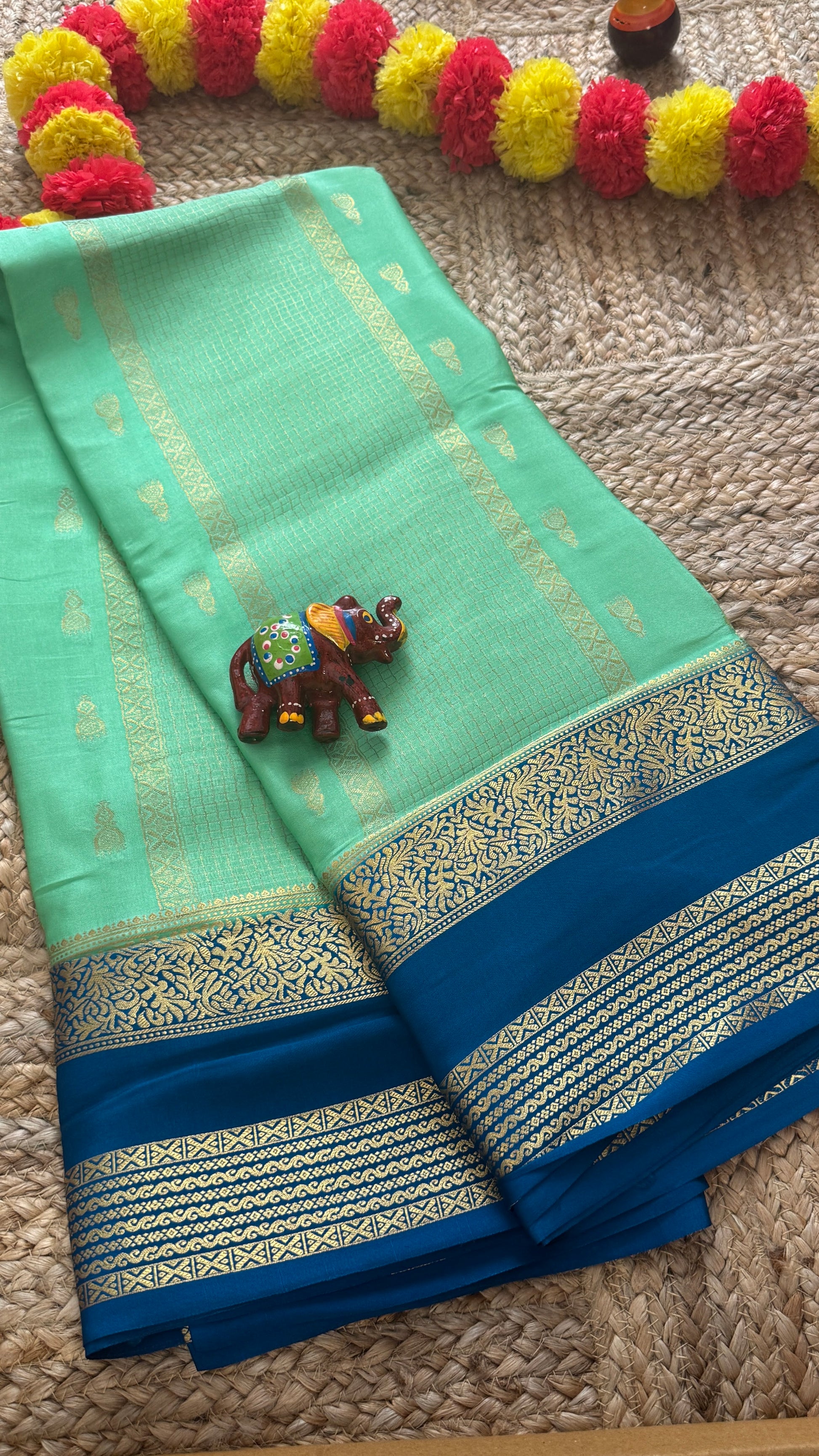Pure Mysore Silk Saree - Jhumka Zari 2D Light Green and Navy Blue