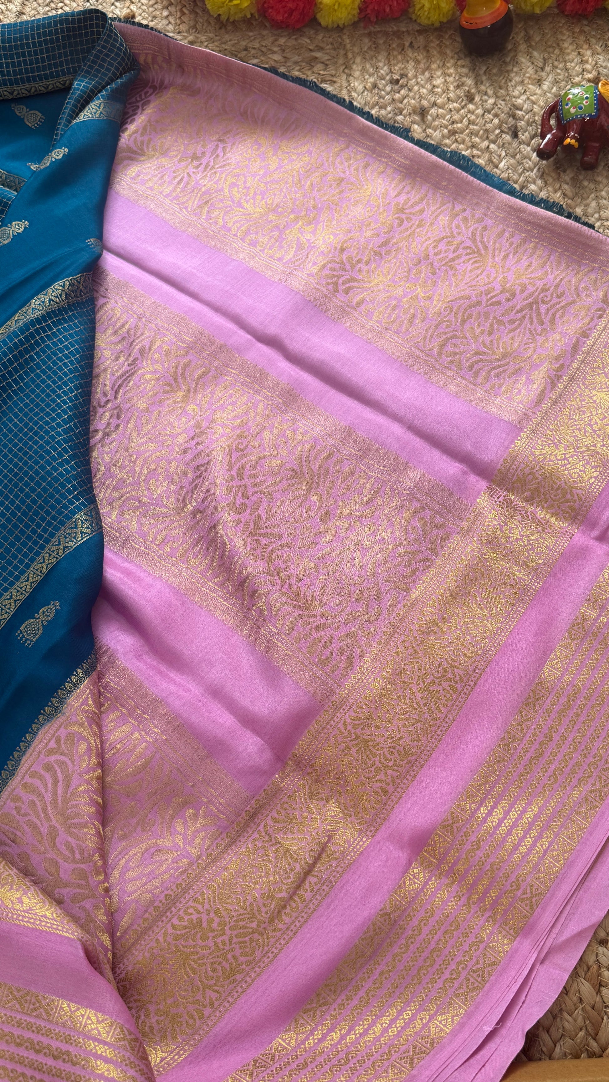 Pure Mysore Silk Saree - Jhumka Zari 2D Peacock Blue and Baby Pink