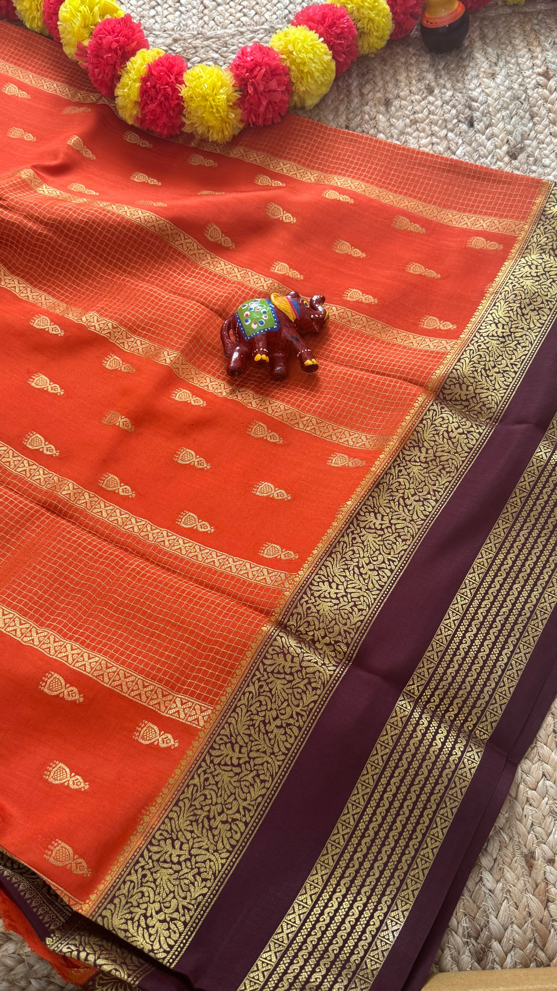 Pure Mysore Silk Saree - Jhumka Zari 2D Rust Orange and Coffee Brown