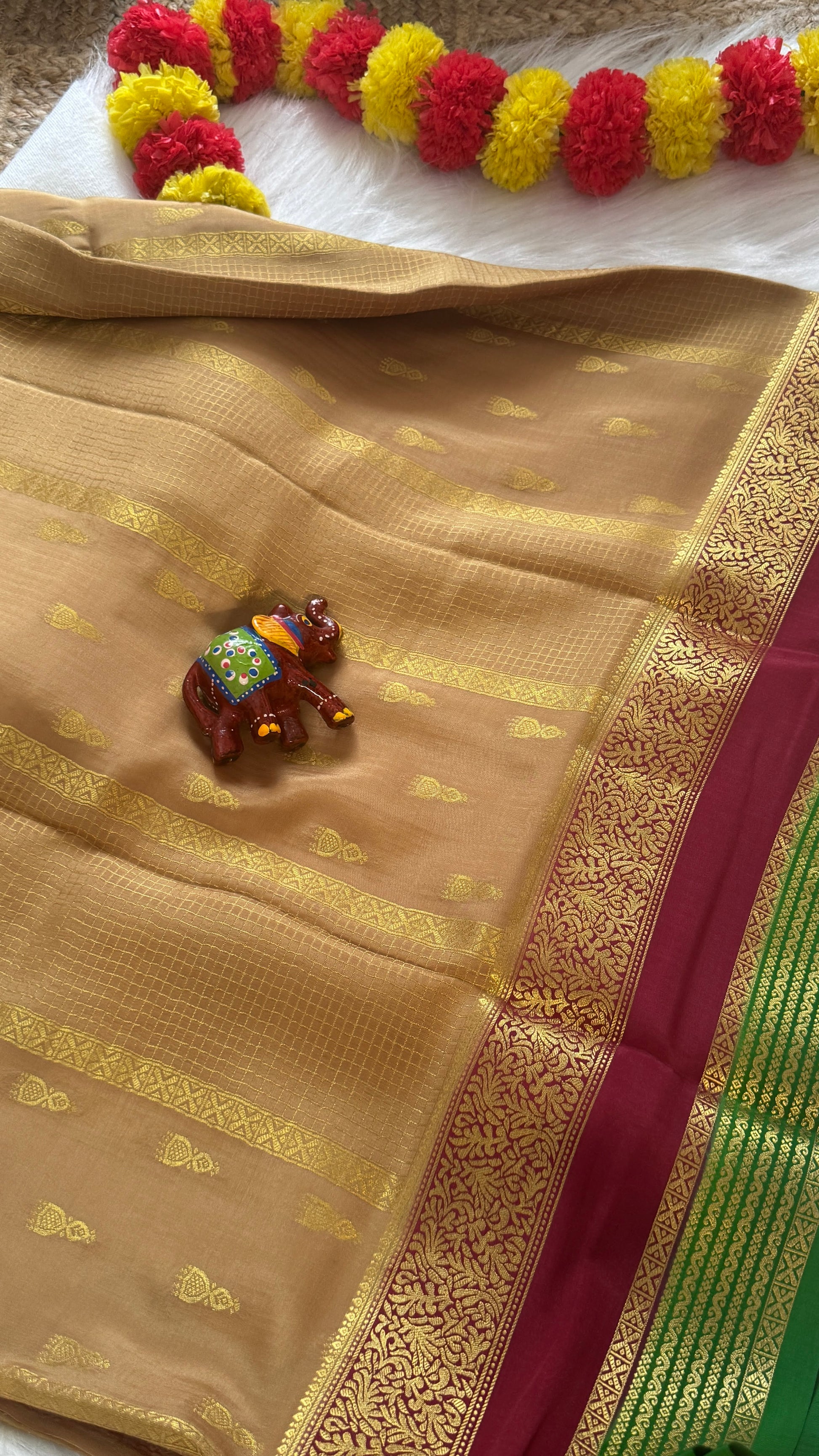 Pure Mysore Silk Saree - Jhumka Zari 3D Beige Maroon and Green