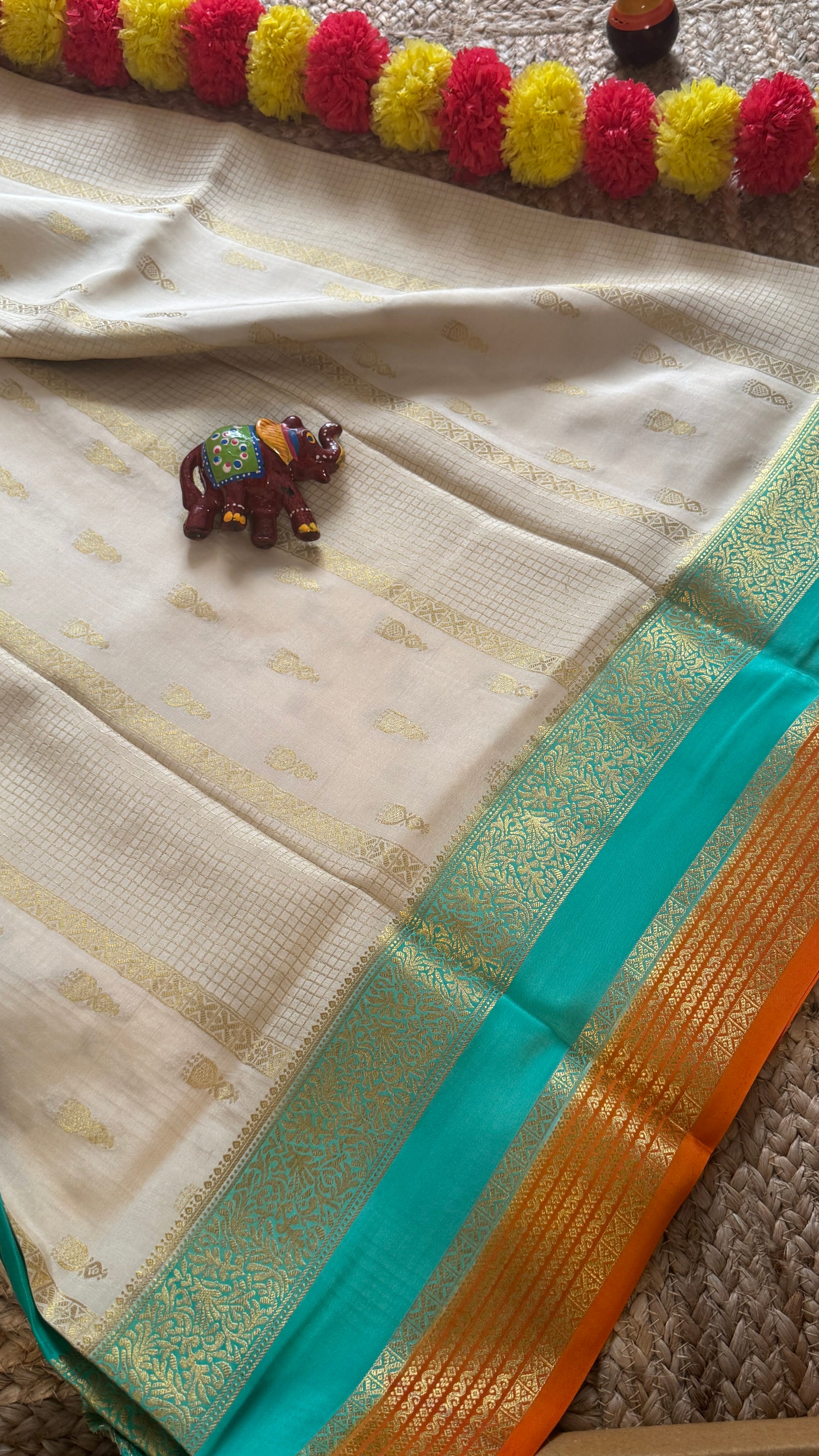 Pure Mysore Silk Saree - Jhumka Zari 3D White Turquoise and Orange
