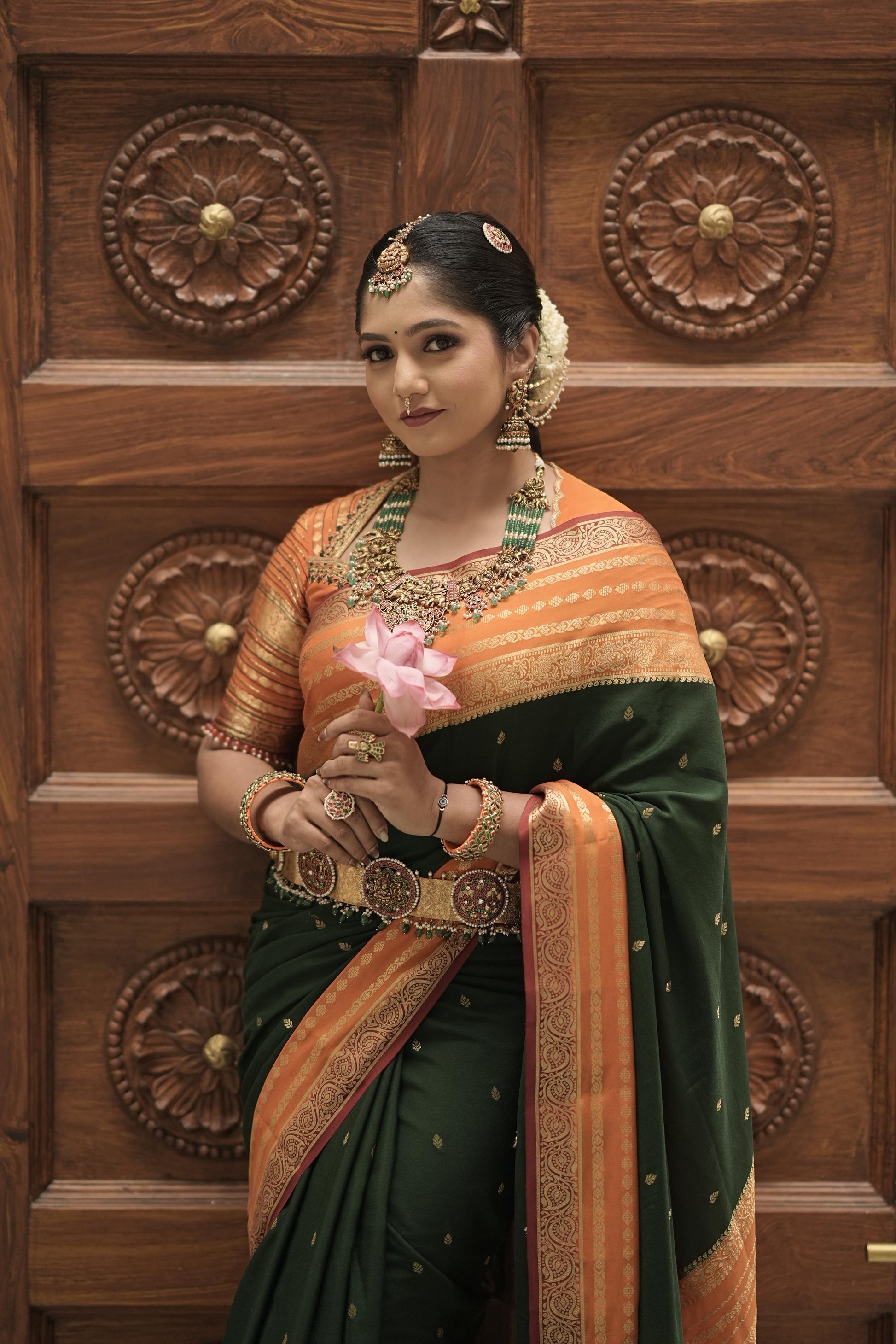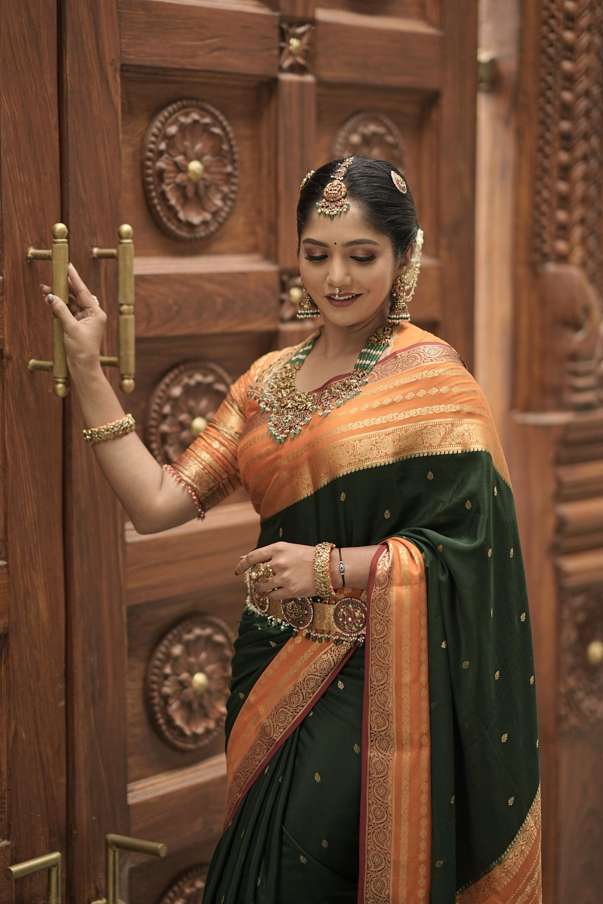 3.Pure Mysore Silk Sarees - Bespoke Drapes - Dark Green & Orange & Red