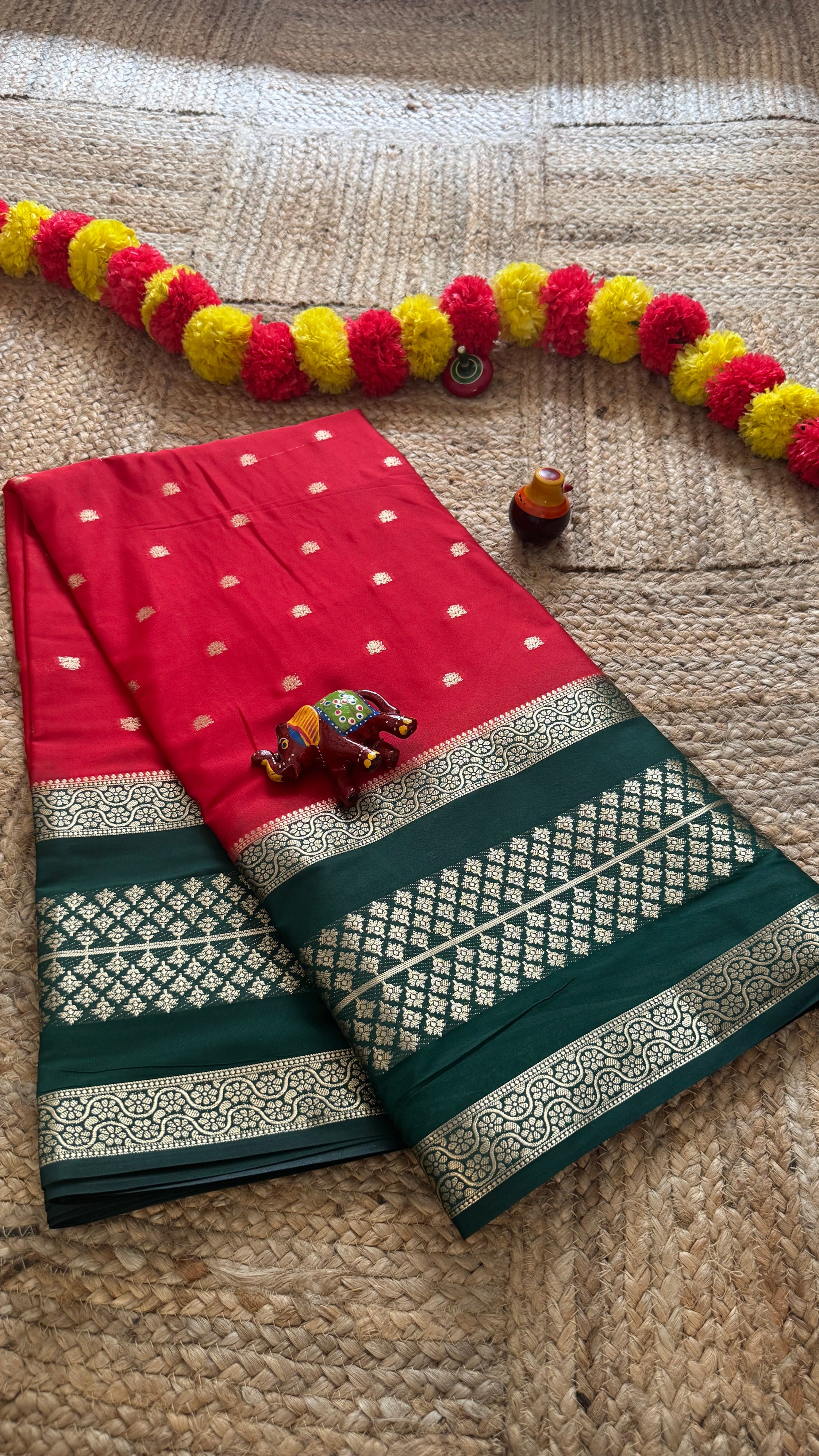 Semi Silk Butta Saree - Red and Green